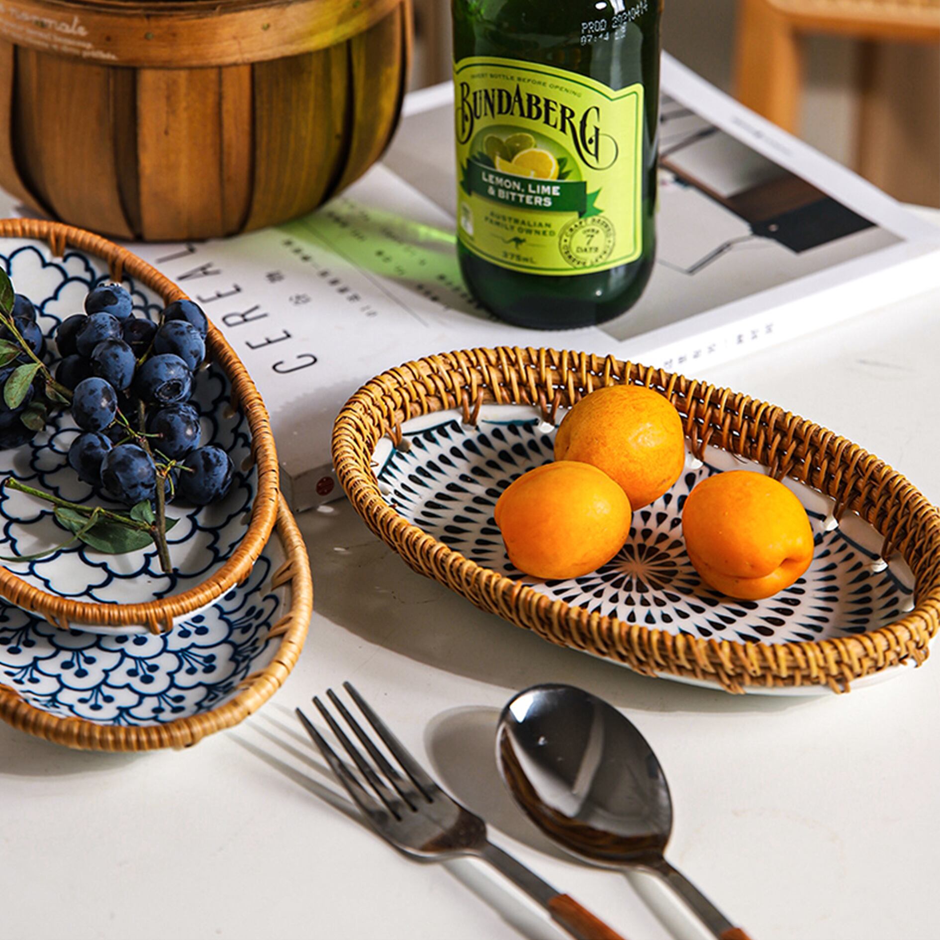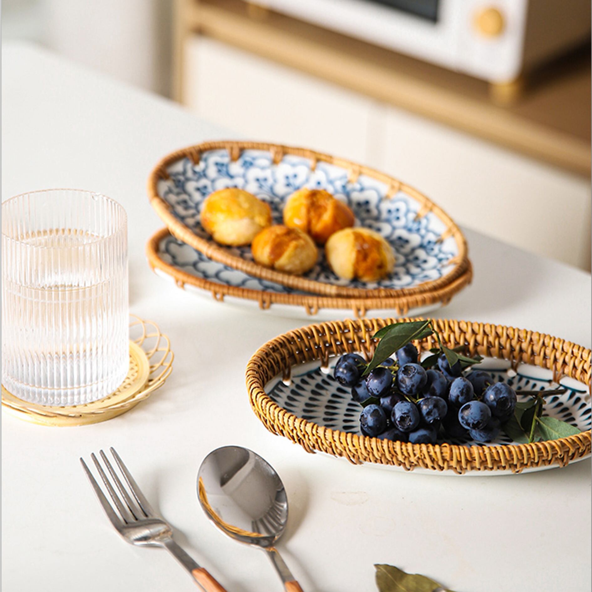 セラミックと天然藤?なんと奇妙な組み合わせ。果物、パン、お菓子、チーズ、唐揚げ、何を入れてもオシャレに見えます。キレイな食卓を演出したいとき最適!