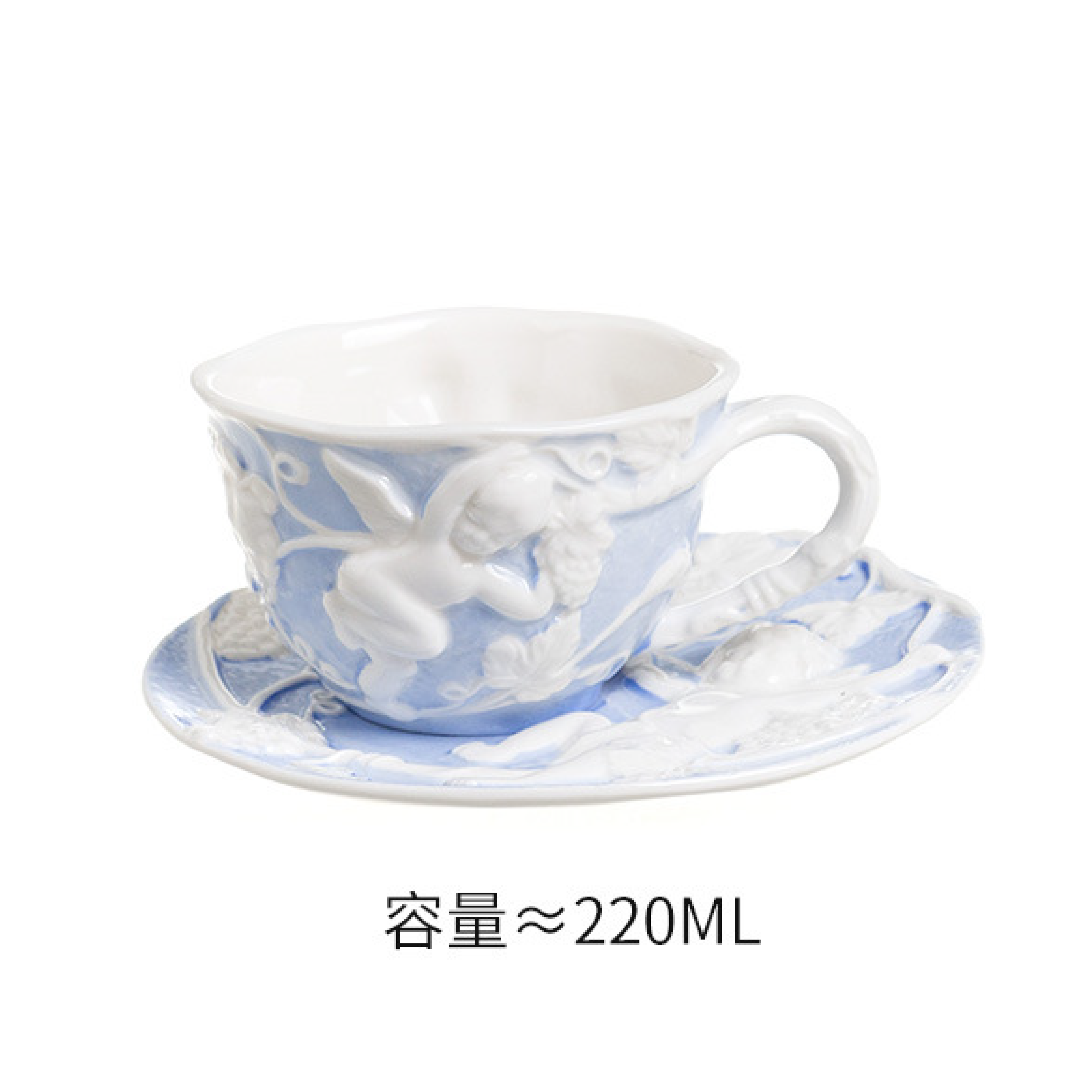 天使の模様があるオシャレなカップです。素朴な絵柄で、食卓に置いても、棚に置いても、見る度に心を癒やしてくれます。セット品ですので、お茶、水、コーヒーなどを入れ、家族も来客もたくさんの場面を対応できます。